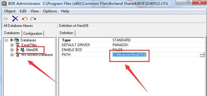 然后找到你新建的数据库名称,左键点击一下,改名为Herodb,更改数据库目录为 C:\Mirserver\Mud2\DB ![]() 关闭保存,这样基本上就修改完成了,然后启动传奇服务端,看看是不是可以正常游戏了! |