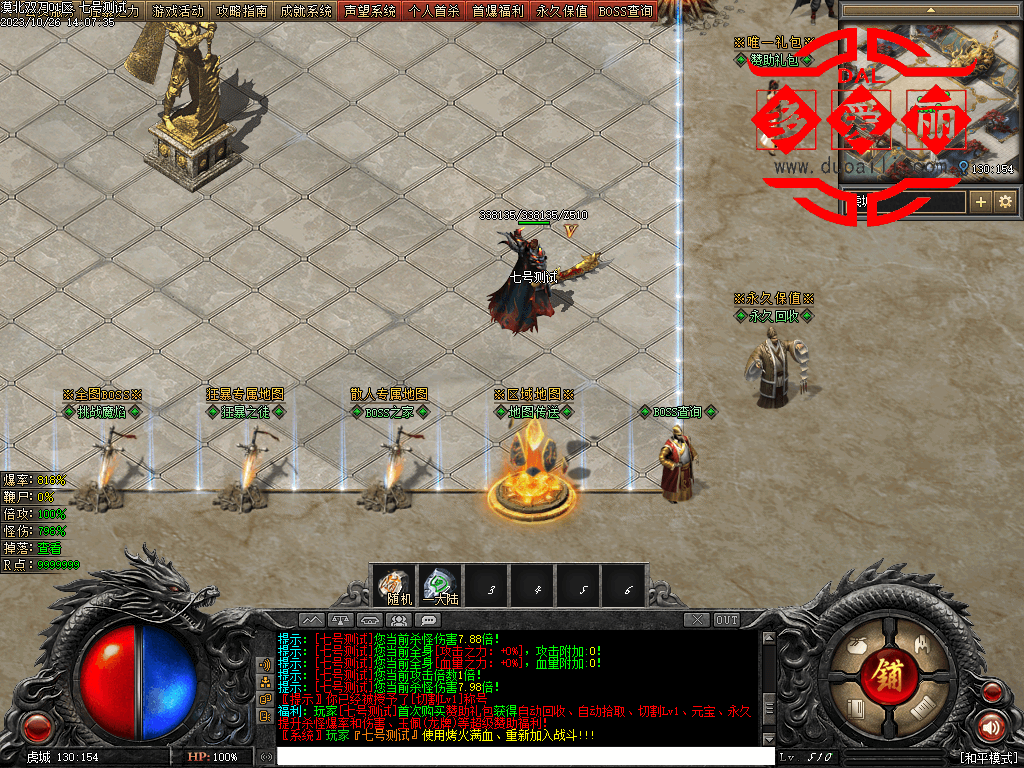 获得提升人物属性 + 10% 获得“龙帝之怒”尊称号 拥有寂灭+顶战魂*1000个+BOSS之血*999个