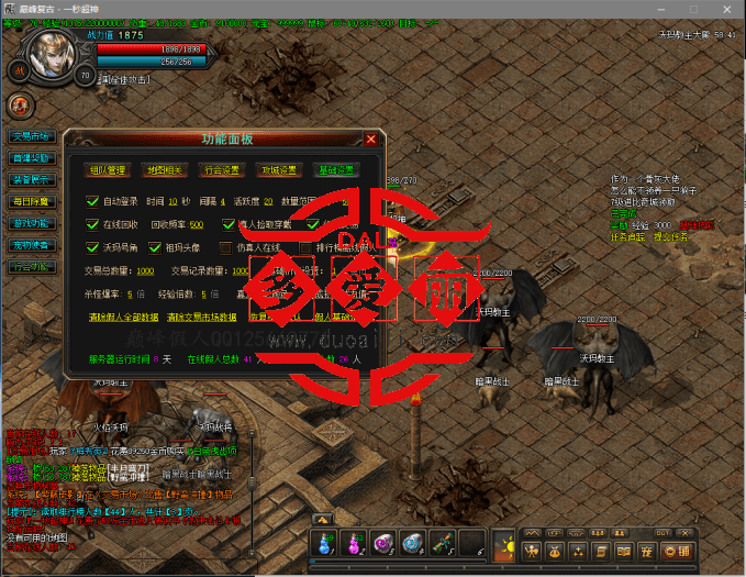 3、假人系统:不想要假人的可以关掉,当然我建议开启,因为巅峰假人真的假人界的巅峰,可以组队,可以打怪,可以自己换装备,可以给它装备,可以攻城,可以PK,可以自己放拍卖行买卖装备,真的是无所不能。