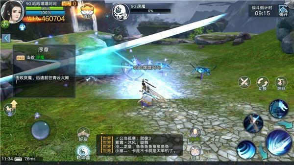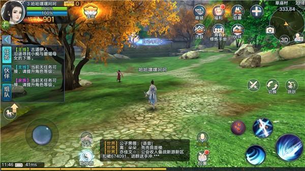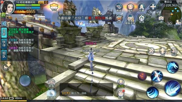 操作上依旧是当下MMO手游通用的一套:以自动代替手动、以特效代替打击感。游戏中角色多达8个技能足以让玩家费点心思,不俗的特效也为头顶蹦出的数值增添几分色彩,同时引入仙侠必备的坐骑飞行玩法,无论是游戏进度还是酷炫程度都比两条腿要强,可惜飞行的平均高度较低,多少让游戏出色的远景设计和自由视角有些无用武之地。