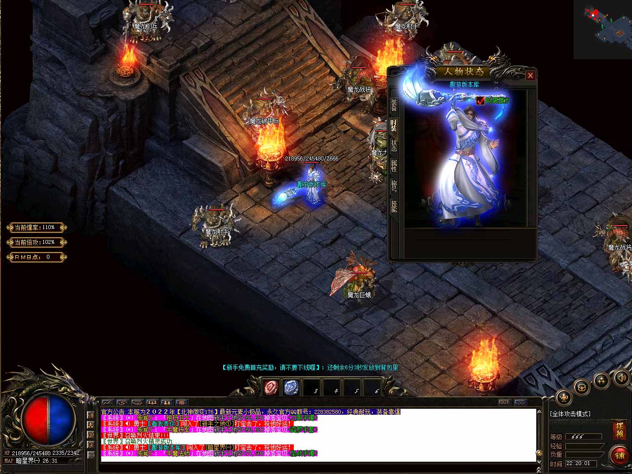 神塔奖励: 第100层100%爆出[次终极或终极)装备随机一件。到达100层可获得《苍玄神尊》称号,赠永久爆率。 此地图为神级地图,一共分为三层。小B0SS-个小时: 大B0SS和终极BOSS两个小时。进入条件: 需要60级+元宝1500