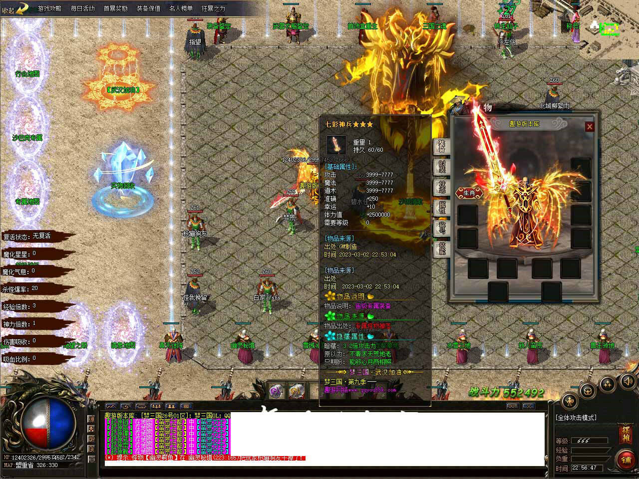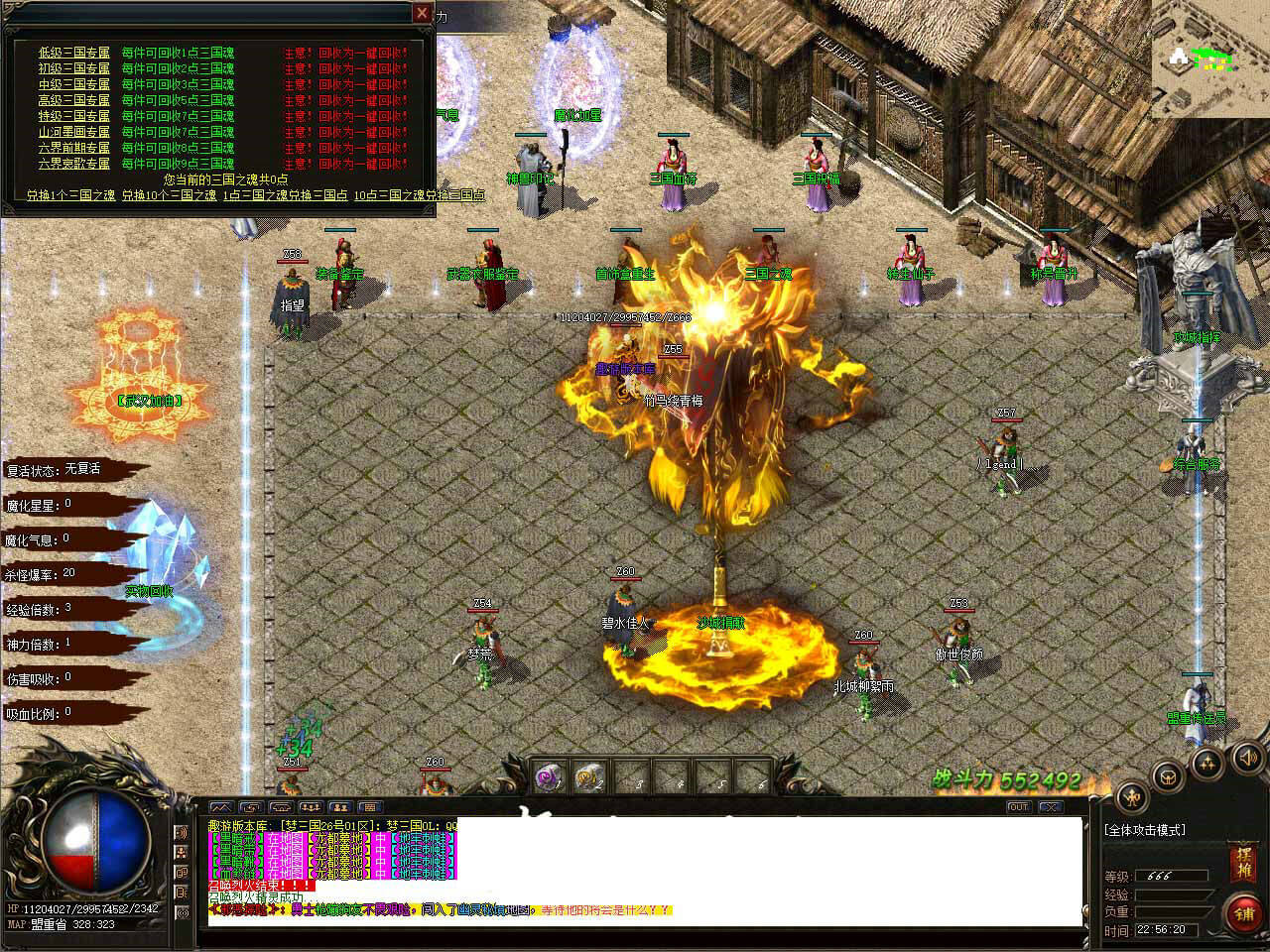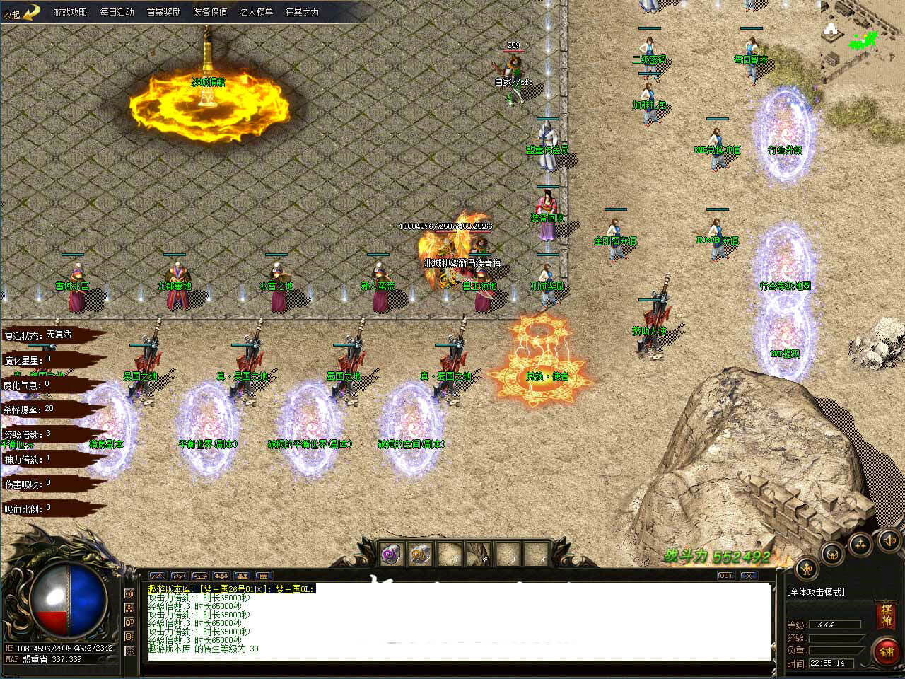 7.在积累一定的装备后0-38充值的玩家最少到100级,100级会送个专属宝宝供散人发育!100充值的玩家因为有黄金赞助上来就有两个宝宝可以考虑打红色的188W的怪物(司马懿、司马昭、孙尚香、诸葛亮、吕梦茹、荀彧)这些怪会爆1.7以下的武器衣服等装备,最主要的是会爆低级的三国专属装备。运气好打到三国装备就可以去三国专属地图,三国专属地图的爆率相对高一些。