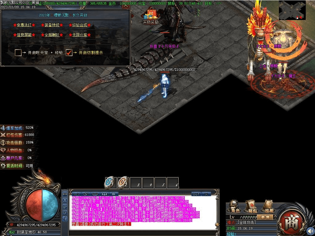 新手地图撸怪!升级 转生 打够元宝首先升级 大主宰无限刀 一大陆开始怪物就有限时奖励 首爆奖励 !本服 材料保值 元宝 保值 散人必定吃肉!