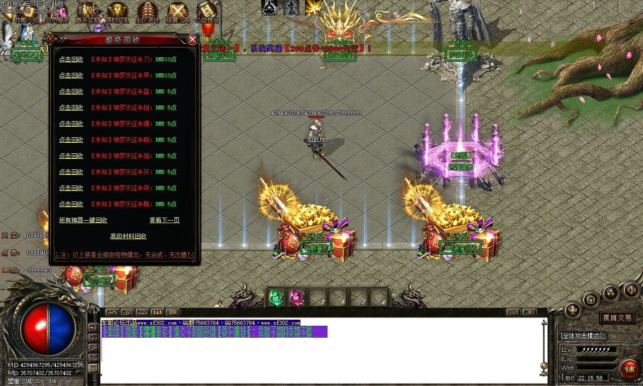 这是一个高清好玩的中变类型单职业传奇服务端,游戏怪物爆率均衡,小怪爆初级装备,福利怪和BOSS会爆出顶级装备,也不会出现一只怪物就爆满屏的情况,不过顶级BOSS和世界BOSS除外,还有一些活动BOSS,可能会出现满屏福利积分等等!游戏中前期装备好打,怪物血量较低,基本上没有什么危险,最好打怪的时机就是刚上线进游戏的时候,因为这个时候还有升级满血,一秒一级自动泡点,所以基本打怪轻松,只要不挑战高等级的怪物被秒掉就没事,想在游戏中赚游戏币的玩家要注意,游戏中的各种材料和不需要的装备,都可以用来回收,然后换取经验和积分,里面也有自动捡取和回收功能,但是需要开通沙捐才可以,自动回收功能可以在高等级以后在使用,不然一些好的装备也会被秒回收掉,得不偿失。