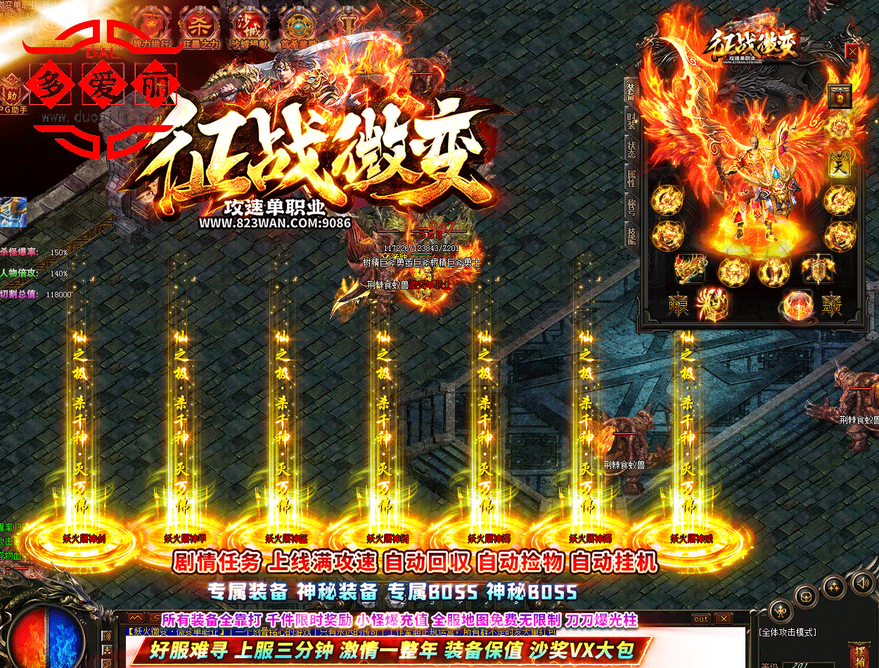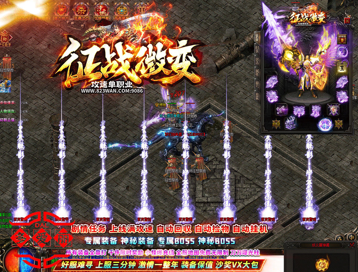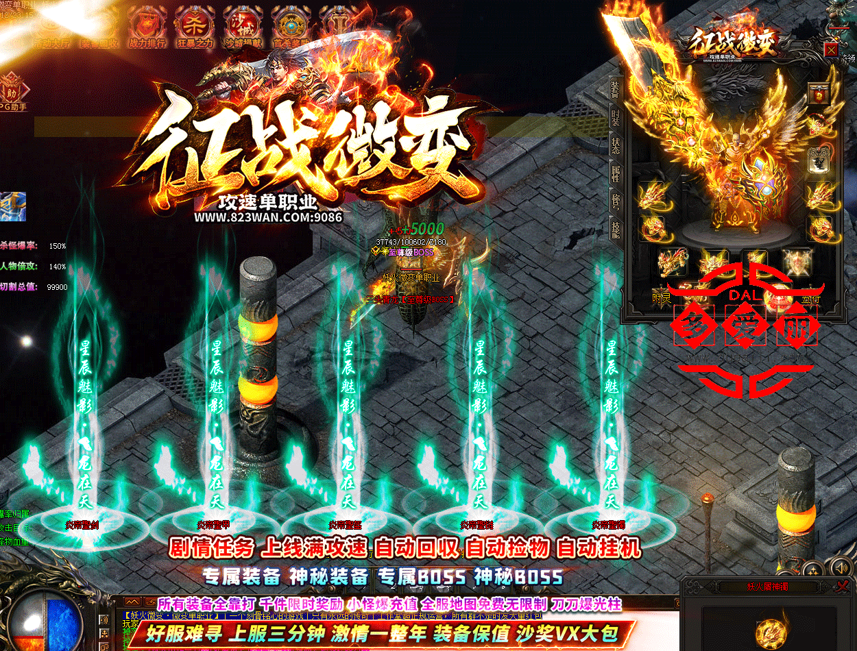 剧情任务 上线满攻速 自动回收 自动捡物:自动挂机专属装备 神秘装备,专属BOSS 神秘BOSS所有装备全靠打 千件限时奖励 小怪爆充值 全服地图免费无限制 刀刀爆光柱