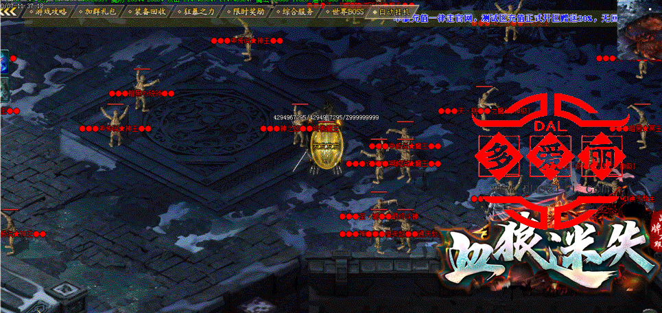 小资:充38元 获得回馈 至尊5件套 开启自动回收自动捡物 开启1挡狂暴(2RMB) 开启沙城捐献(30RMB) 有刀刀168W 伤害 爆率200%