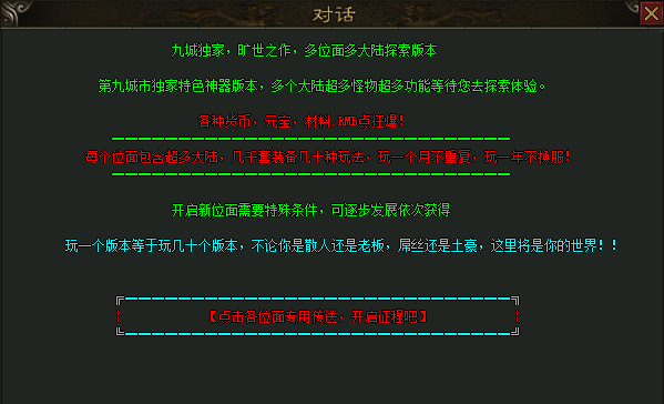 开启新位面需要特殊条件,散人可逐步发展依次获得,本服承诺慢慢发育都能达成